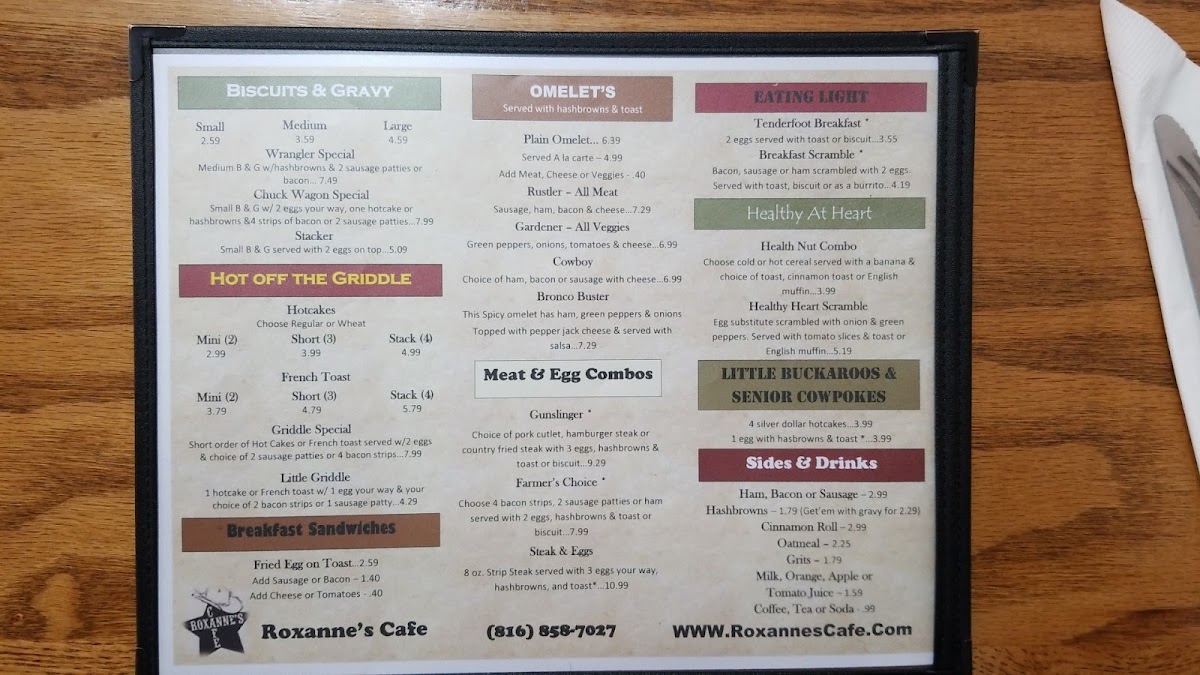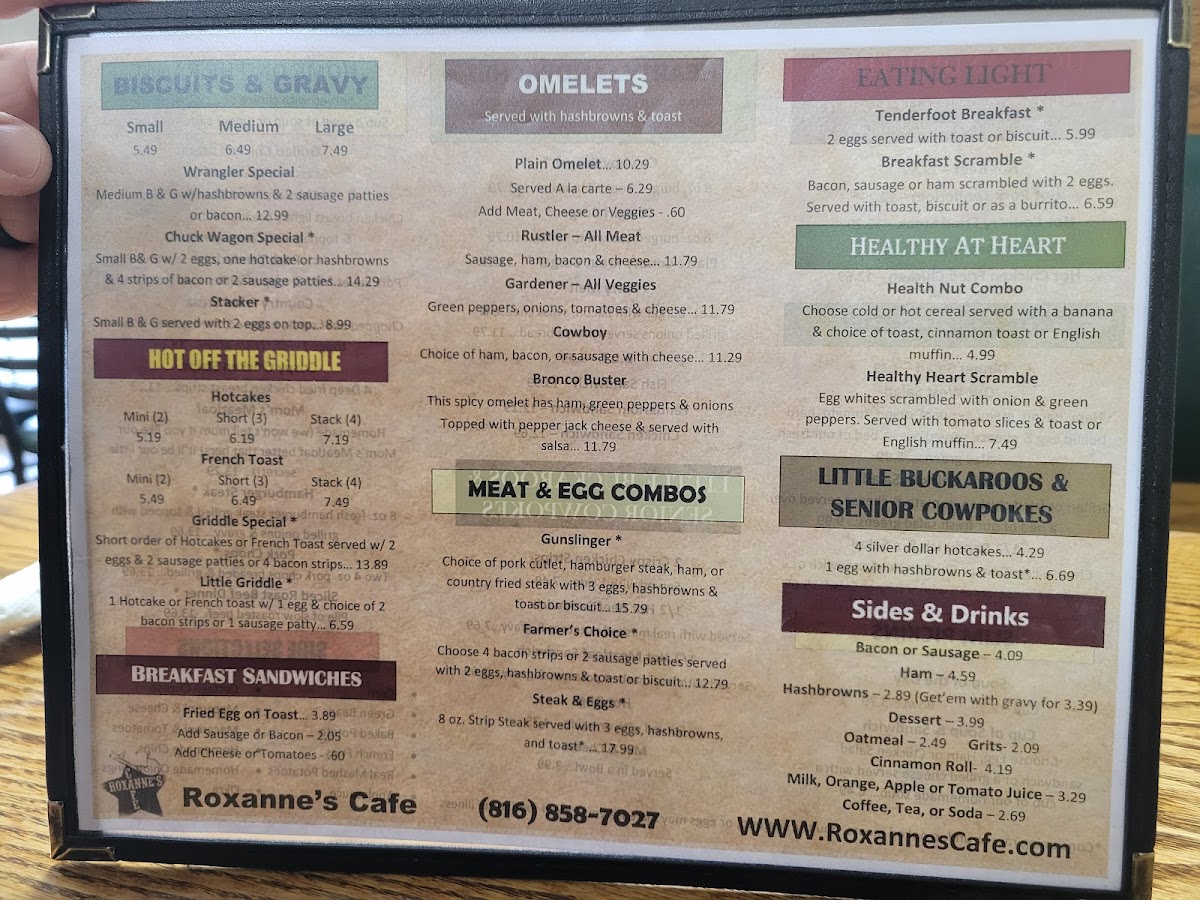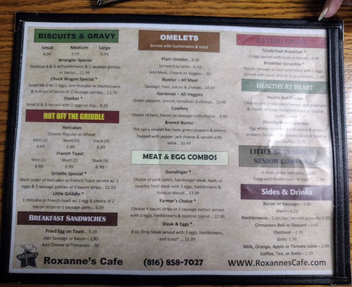 Roxanne's Cafe offers a straightforward menu reflecting classic American breakfast and comfort food favorites. The selections focus on hearty, satisfying dishes — think simple, familiar preparations that pair well with a relaxed, no-frills setting. Whether it's a morning visit or a casual lunch, the menu leans into timeless comfort with options like hot sandwiches featuring meats such as beef, pork tenderloin, and chicken fried chicken, alongside traditional breakfast staples like French toast and omelets.